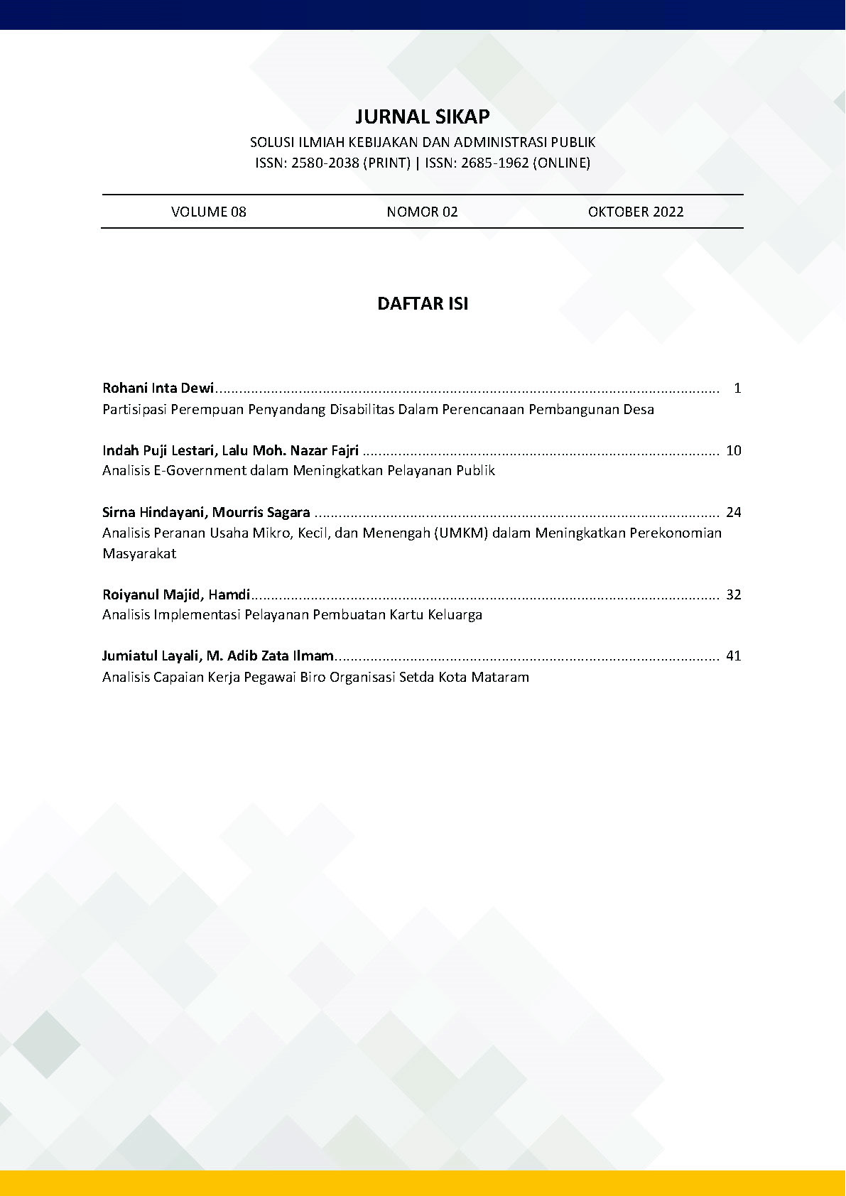 Jurnal SIKAP (Solusi Ilmiah Kebijakan dan Administrasi Publik) dengan nomor ISSN: 2580-2038 (Print) dan ISSN: 2685-1962 (Online) adalah sebuah jurnal multidisiplin yang dipublikasikan oleh Fakultas Ilmu Administrasi Universitas Nahdlatul Wathan Mataram (FIA UNW Mataram) dua kali dalam setahun. SIKAP terfokus kepada permasalahan-permasalahan utama dalam lingkup kebijakan dan administrasi publik mencakup pengembangan administrasi, otonomi daerah dan birokrasi, aparatur negara, desentralisasi, pengembangan ekonomi dan sains, manajemen publik, tata kelola dan kebijakannya, dan setiap ilmu sosial yang mencakup politik fiskal, dan perencanaan daerah. Tujuan dari penerbitan jurnal ini adalah sebagai salah satu sarana untuk mewadahi peningkatkan kuantitas dan kualitas pengembangan Ilmu Kebijakan dan Administrasi Publik yang sesuai dengan amanah konstitusi UUD 1945 NKRI, serta menyebarluaskan kajian Ilmu Kebijakan dan Administrasi Publik, sekaligus sebagai wahana komunikasi di antara cendekiawan, praktisi, mahasiswa dan pemerhati masalah dan praktik Kebijakan dan Administrasi Publik. E-mail: sikap@unwmataram.ac.id