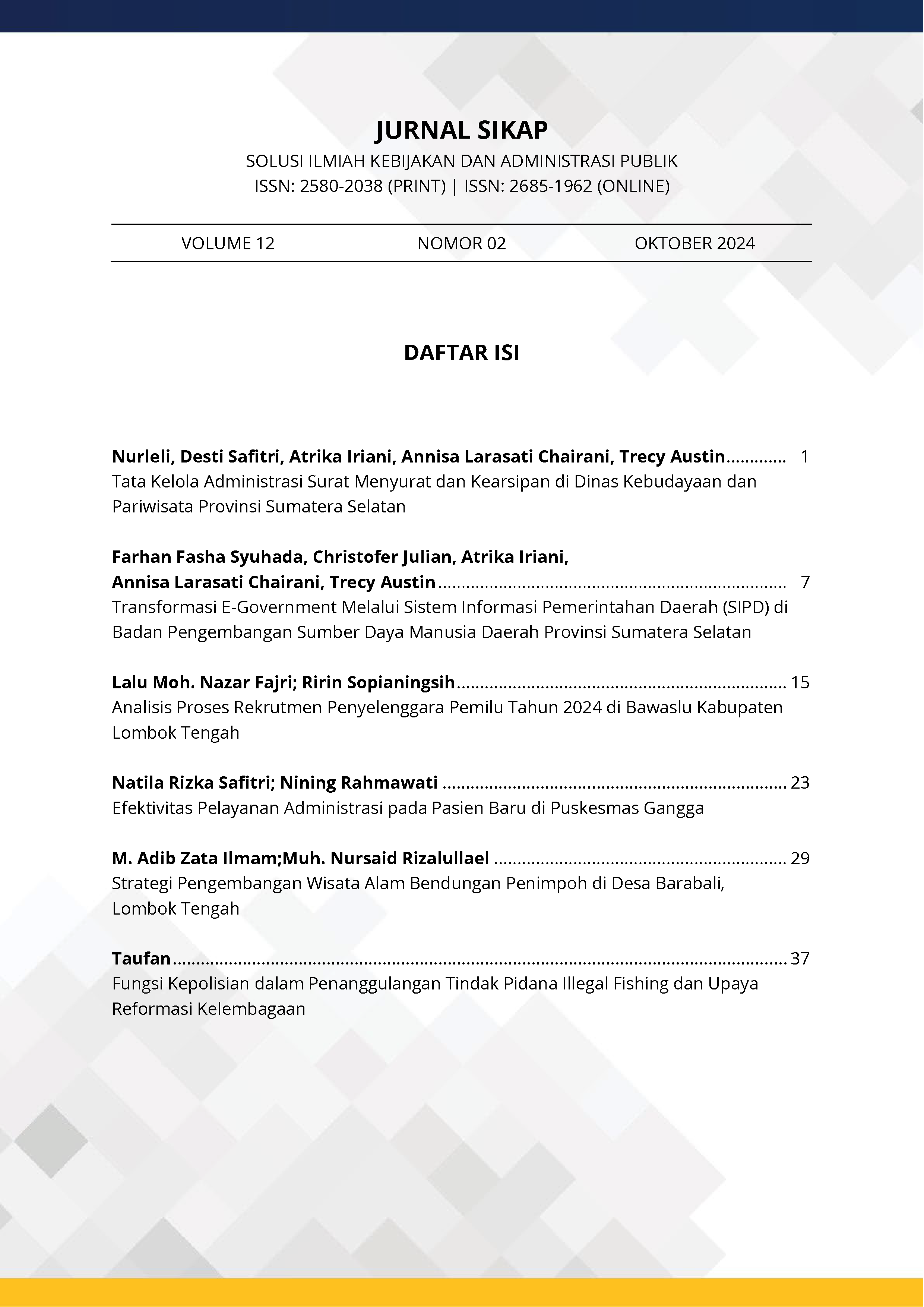 Jurnal SIKAP (Solusi Ilmiah Kebijakan dan Administrasi Publik) dengan nomor ISSN: 2580-2038 (Print) dan ISSN: 2685-1962 (Online) adalah sebuah jurnal multidisiplin yang dipublikasikan oleh Fakultas Ilmu Administrasi Universitas Nahdlatul Wathan Mataram (FIA UNW Mataram) dua kali dalam setahun. SIKAP terfokus kepada permasalahan-permasalahan utama dalam lingkup kebijakan dan administrasi publik mencakup pengembangan administrasi, otonomi daerah dan birokrasi, aparatur negara, desentralisasi, pengembangan ekonomi dan sains, manajemen publik, tata kelola dan kebijakannya, dan setiap ilmu sosial yang mencakup politik fiskal, dan perencanaan daerah. Tujuan dari penerbitan jurnal ini adalah sebagai salah satu sarana untuk mewadahi peningkatkan kuantitas dan kualitas pengembangan Ilmu Kebijakan dan Administrasi Publik yang sesuai dengan amanah konstitusi UUD 1945 NKRI, serta menyebarluaskan kajian Ilmu Kebijakan dan Administrasi Publik, sekaligus sebagai wahana komunikasi di antara cendekiawan, praktisi, mahasiswa dan pemerhati masalah dan praktik Kebijakan dan Administrasi Publik. E-mail: sikap@unwmataram.ac.id